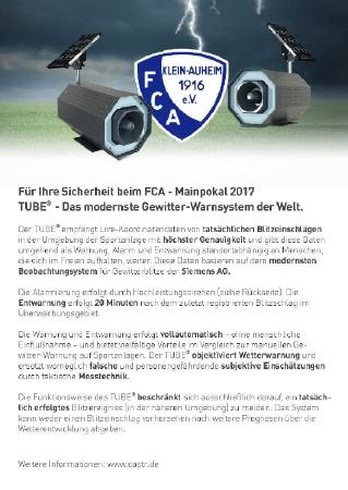 In Klein-Auheim wird dieses Jahr das vollautomatisches Gewitterwarnsystem TUBE getestet.Hinweise werden auf dem Sportplatz in ausreichender Form verteilt.